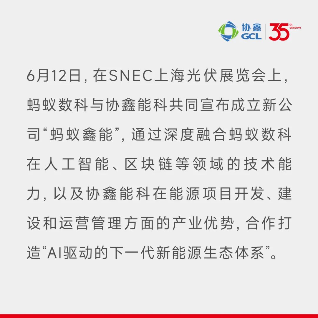 蚂蚁集团副总裁、蚂蚁数科区块链业务总裁边卓群表示,蚂蚁鑫能的成立标志着前沿技术深度赋能能源产业迈出关键一步。期待与协鑫能科深化合作,共同构建智能高效的能源服务体系,助力“双碳”目标和可持续发展。