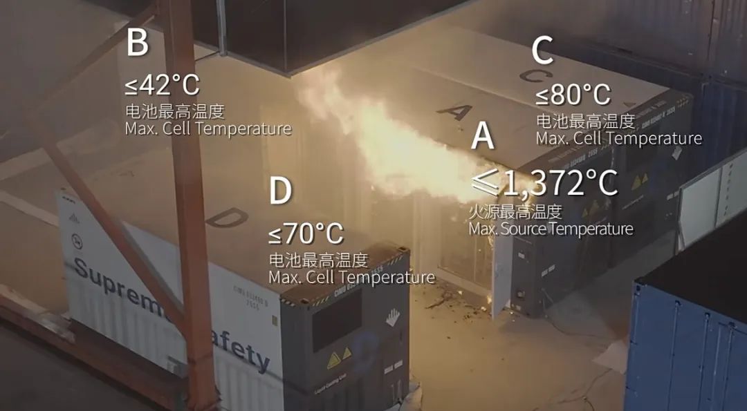 火势峰值阶段:试验第4小时达到最高温度 1372摄氏度,温度监测显示,所有相邻集装箱内的电芯温度均远低于UL9540A电芯层级测试测定的电芯热失控触发阈值温度(B箱≤42℃,C箱≤80℃,D箱≤70℃)。