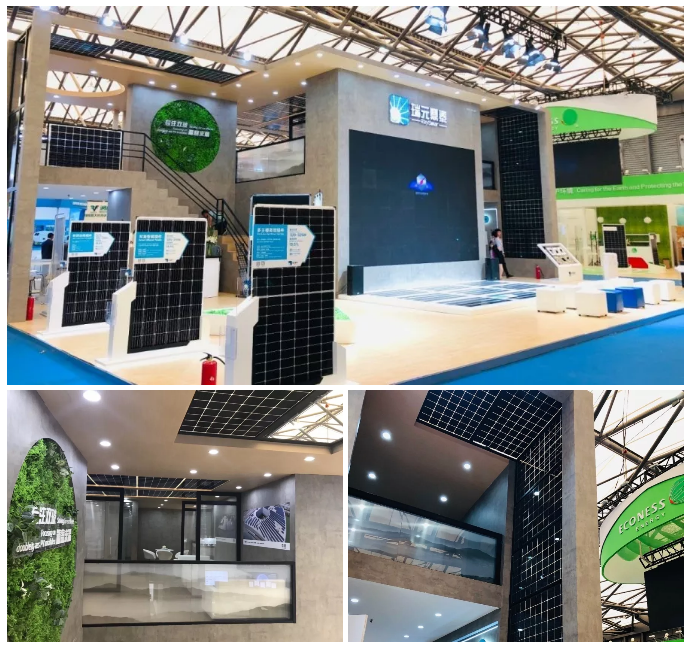 本次瑞元展台以“让金色阳光还原自然本色”的使命理念进行搭建。展台整体以工业住宅风格设计搭建,水泥外墙辅以10%透光双玻组件,光电一体化科技住宅获得观众好评!