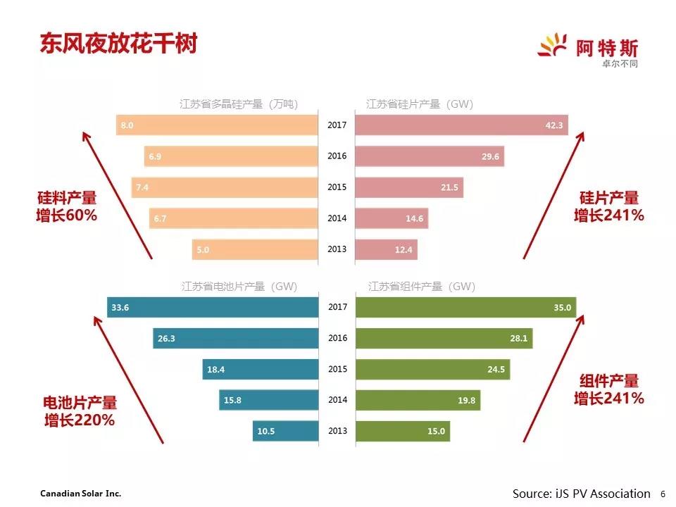 2017年全省光伏制造企业接近500家,从业人数约12.6万人,全年完成产值3264亿元,较2016年同期增长了48%。