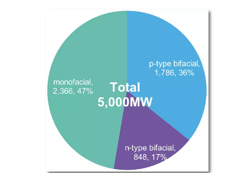 根据彭博新能源财经对第三批领跑者中采用组件技术分类的相关统计数据显示,双面组件应用量达2634MW,其中N型双面组件达到848MW,大有追赶P型双面组件之势(如