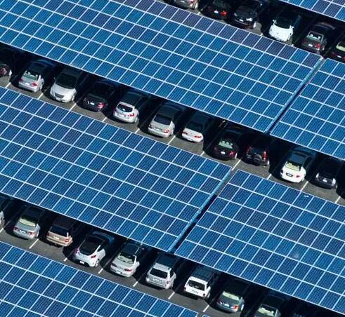 在美国加州克罗维斯市的中心社区学院,一排排光伏组件整齐的排列在停车场顶棚。