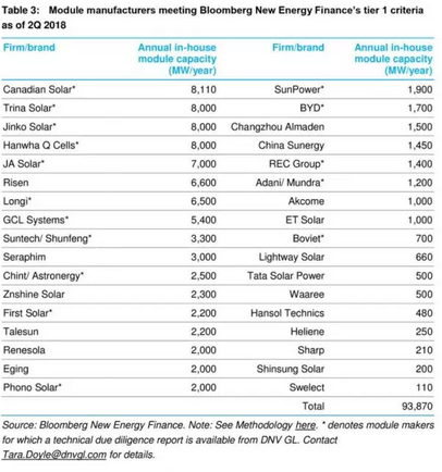 光伏组件制造商排名分级系统是彭博新能源财经自主开发建立的供应商评级体制。该报告根据各大太阳能光伏组件制造商“银行可融资性”进行分级,在全球范围内数百家光伏组件企业中做出透明化区分。“银行可融资性”代表了光伏企业产品项目对于其是否能够得到银行无追索权的债务融资,且彭博新能源财经也通过其完备的数据库中追踪到各制造商已完结的交易项目作为调研评判的基础条件之一。