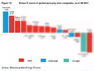 此外,BNEF在本次报告中给出的Altman-Z评分指数显示,2017年第四季度,隆基乐叶财务健康度在全球光伏企业中位列第二。Altman-Z指数用于反应制造商财务健康度的比率指标,能够有效反映一个公司两年内破产的可能性,得分越高证明该企业财务度越为安全。