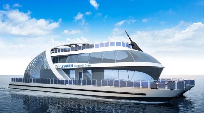 280客位“蓝海豚”游船总长38.8m,型宽12.0m,型深3.2m,航速10.0kn,将搭载亿纬动力磷酸铁锂电池,容量达2.5MWh,是粤港澳大湾区入级商业运营的新能源客船,外观设计新颖独特,纯电池动力突显低噪音、低排放、绿色环保的优势,对于推动粤港澳大湾区旅游和交通产业的绿色发展具有重要意义。