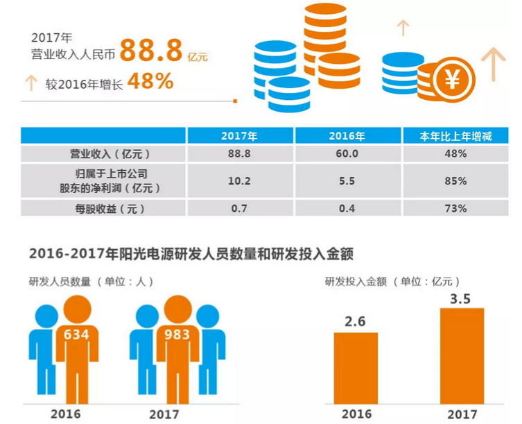 2017年,阳光电源以“坚韧不拔、勇于变革、敬业尽责、成就客户”为指导思想,立足国内,大力拓展海外市场,强化逆变器、储能等海外市场的营销能力建设,持续优化产品结构、升级系统解决方案,强化研发能力建设,积极推出新品,完善现有产品,主要产品核心技术得到提升,同时公司光伏电站系统集成业务也快速发展。