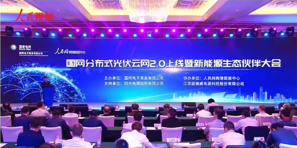 为聚合分布式光伏产业链资源,服务国家新能源发展,全面助力精准脱贫攻坚,2018年4月26日,由国网电子商务有限公司主办,人民网数据舆情中心协办,江苏固德威电源科技股份有限公司和阳光电源股份有限公司支持的国网分布式光伏云网2.0上线暨新能源生态伙伴大会在北京隆重举行。政府领导、行业协会领导、学界专家、生态伙伴齐聚一堂,见证光伏云网2.0全新上线,共同探讨“互联网+能源”融合创新发展新业态、新模式、新趋势。