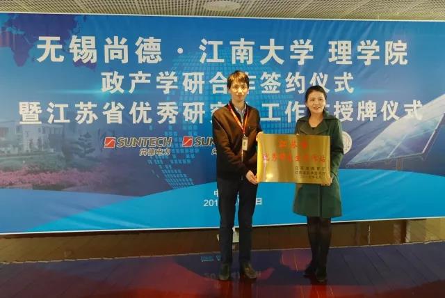 2017年,无锡尚德与江南大学合作共建的研究生工作站被江苏省教育厅、江苏省科技厅评为首批“江苏省优秀研究生工作站”称号。从2011年至今,无锡尚德为进入工作站的研究生提供科研设备平台和实验耗材,协助申请政府补贴。期间,江南大学也大力支持着研究生团队的建设工作,积极鼓励和引导研究生导师与企业合作,积极推荐优秀研究生参与企业研发工作。