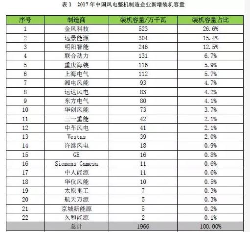 近日, 中国风能协会发布2017年中国风电吊装容量统计简报。结果显示,2017年全国(除港、澳、台地区外)新增装机容量1966万千瓦,同比下降15.9%;累计装机容量达到1.88亿千瓦,同比增长11.7%。其中,新疆金风科技股份有限公司(下称“金风科技”)新增装机容量达到523万千瓦,市场份额达到26.6%,位列全国第一。2017年其营业收入达到251.29亿元,净利润达30.55亿元。