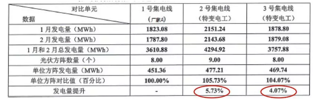 我们通过对比分析各集电线路独立电表获取的计量数据,截取了2018年1月份和2月份两个月的发电数据。结果让人感到意外,应用不同逆变器的3个集电电线2个月的发电量差异竟然高达4%以上,具体数据如下: