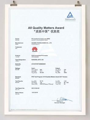 凭借一流的品质,华为的户用逆变器产品经过严格测试后脱颖而出,获得“质胜中国”的逆变器最高质量大奖,树立了业界质量的标杆,可谓名副其实,众望所归。