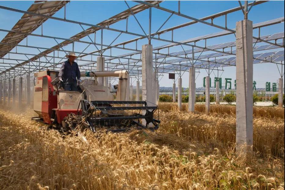 2015年,中利集团创新推出的“智能光伏+科技农业”项目,主要以集中式扶贫电站为主。不同于普通的地面扶贫电站,中利的“智能光伏+科技农业”项目,将光伏支架桩距跨度扩宽到10米,组件高度抬高到4米以上,实现了大型机械化耕种。光伏组件单板安装、倾斜度等技术,满足了农作物太阳光照达到70%以上。
