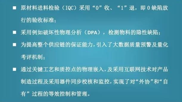 按照6希格玛质量管理体系及不良率小于百万分之四的要求,基于技术质量和可靠性的风险分析结果,采用了更为完整、趋于严酷的整机设计和器件选型及导入过程的评审、验证和确认流程;