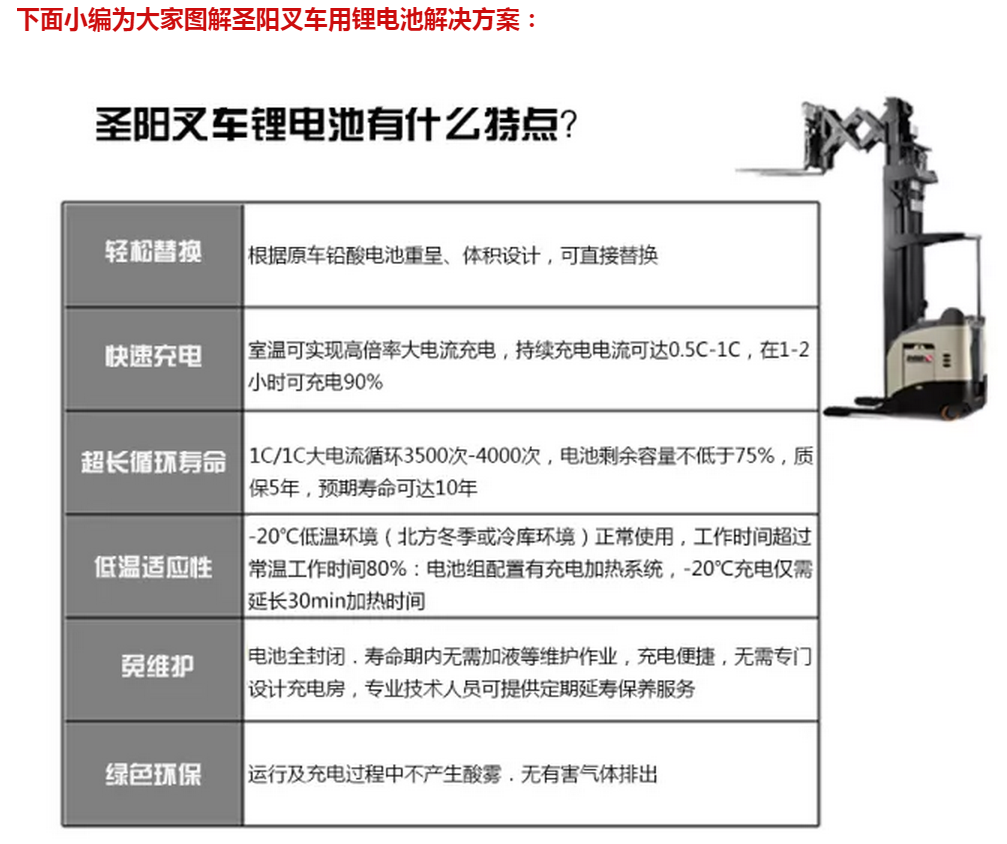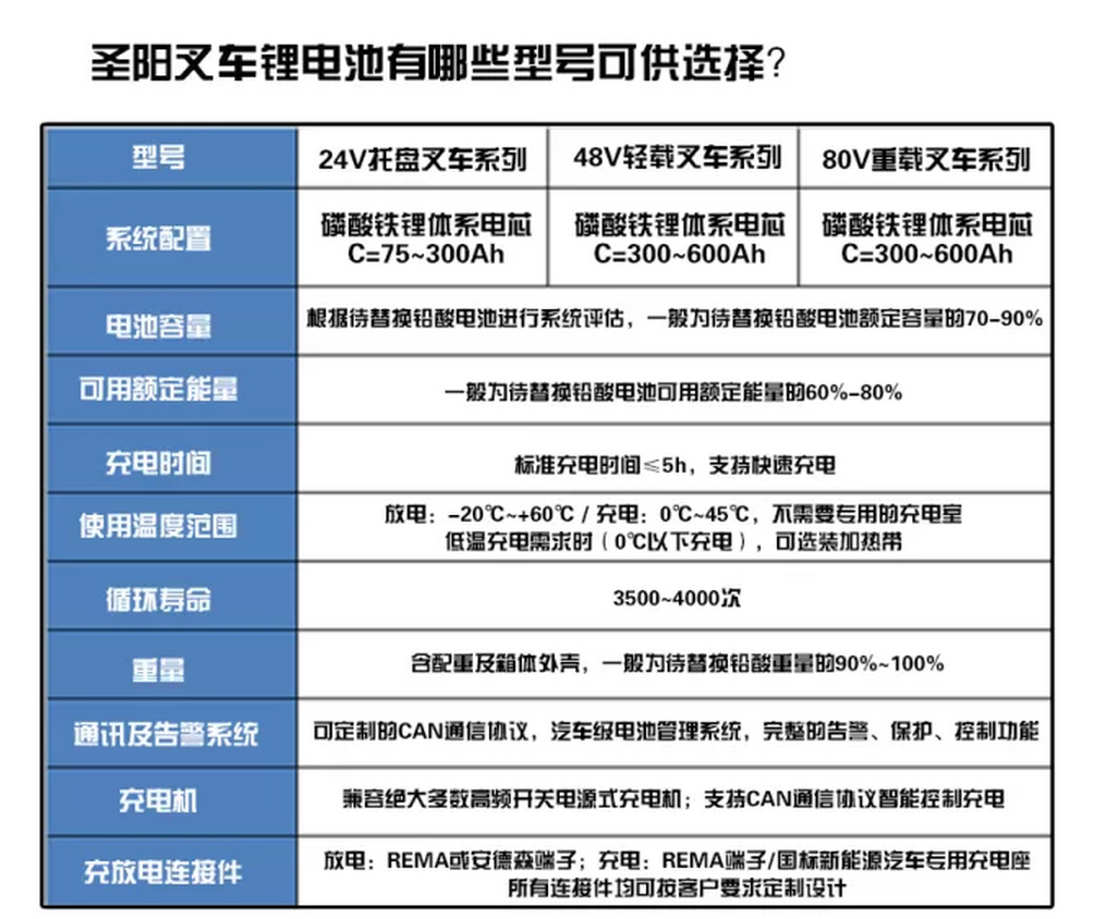 圣阳电源作为绿色能源的积极倡导者,长期致力于为客户提供绿色优质的产品与服务。公司生产的24V、48V、80V锂离子叉车蓄电池采用磷酸铁锂电极材料,不仅具有可靠性高,循环寿命长,充放电倍率大等特点,还可根据客户实际需求提供定制化系统解决方案。