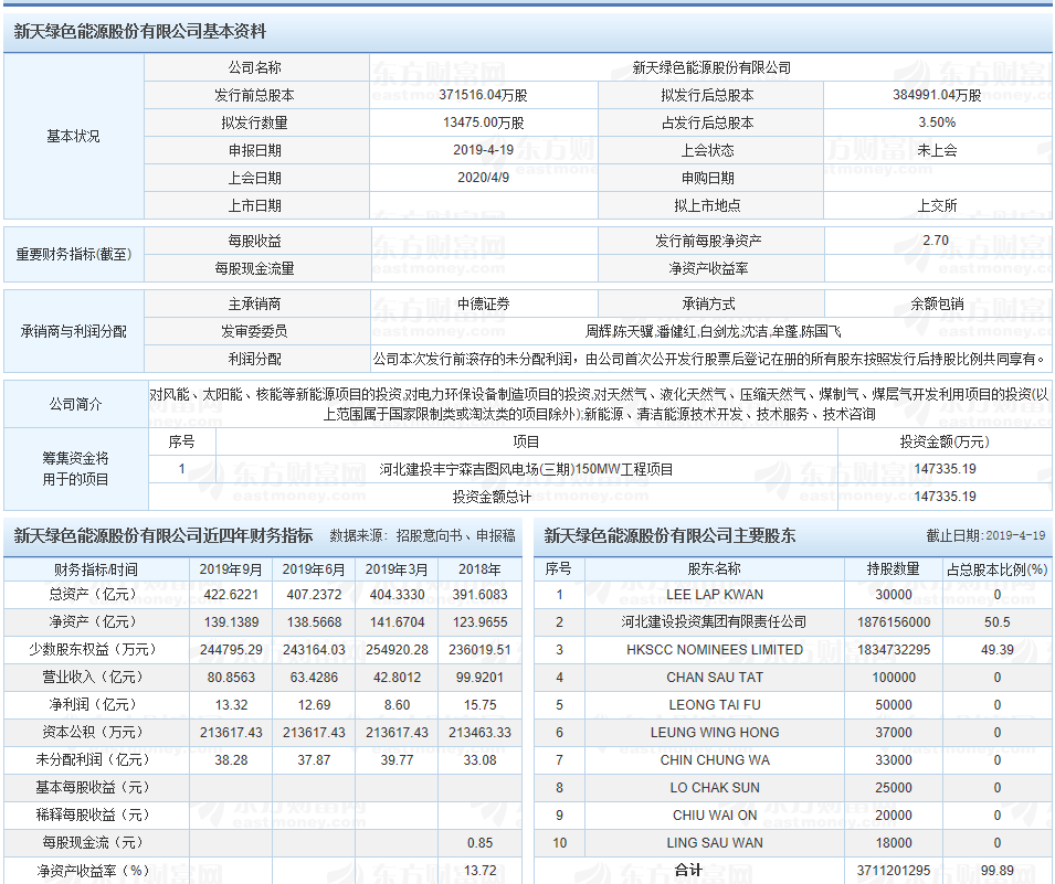 据悉,新天绿能本次公开发行不超过13475万股人民币普通股(A 股),实际募集资金净额将根据发行情况确定,用于河北建投丰宁森吉图风电场(三期)150MW工程项目。本次公开发行A 股股票募集资金扣除发行费用后拟投入到河北建投丰宁森吉图风电场(三期)150MW工程项目,该项目总投资为人民币147335.19 万元,拟使用募集资金人民币44200.56 万元。