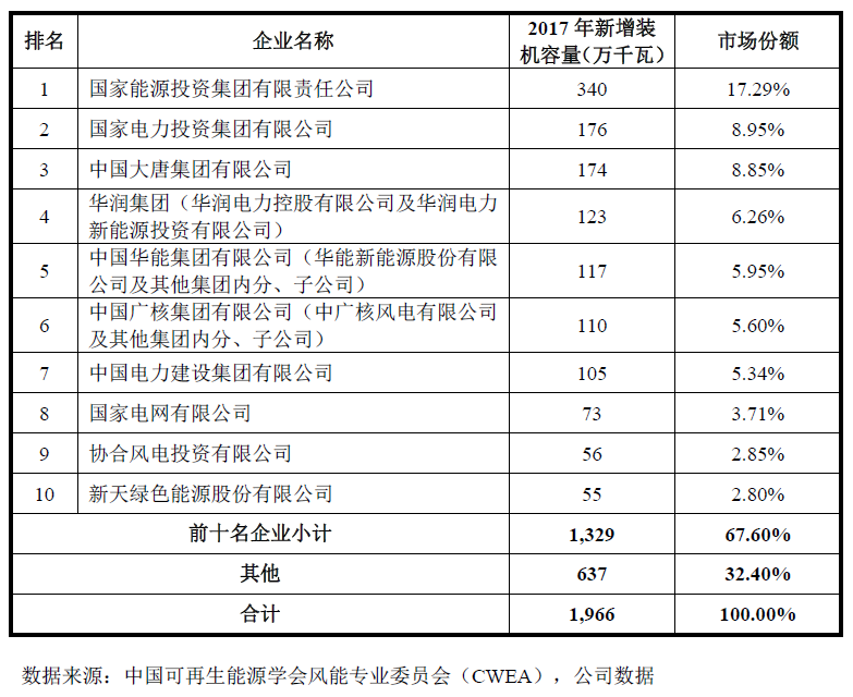 风电市场竞争情况:2017年我国风电新增装机容量排名前十名企业及市场份额情况具体如下