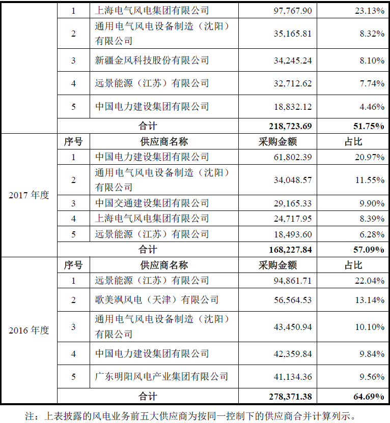 报告期内,公司风电业务前五大供应商采购金额及占比情况如下:
