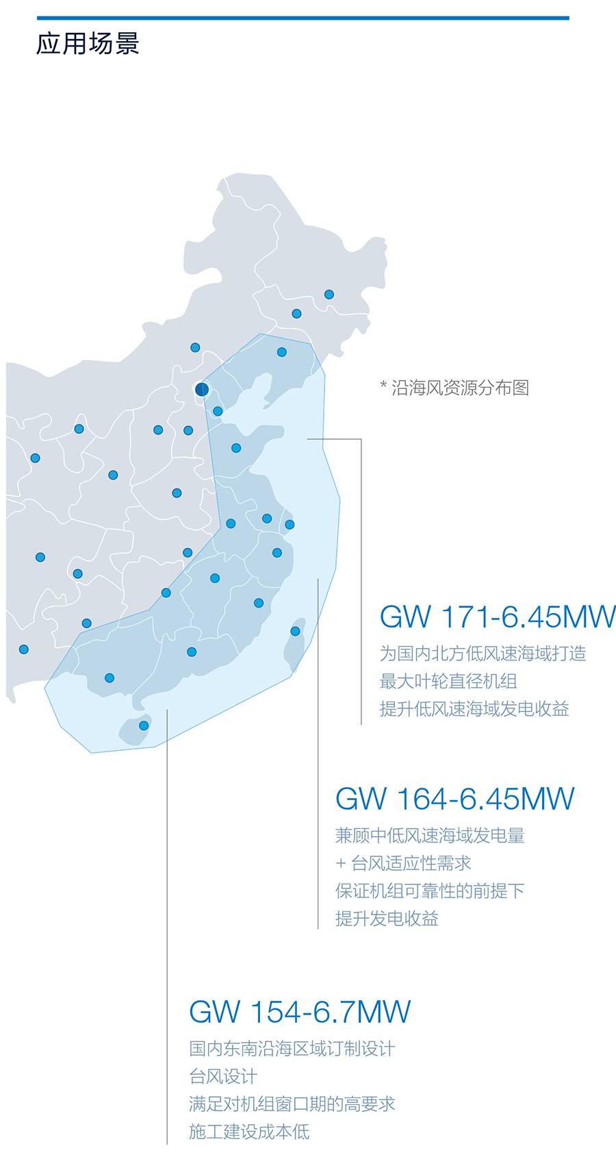 江苏及其以北海域属于III类风区以下地区,90m轮毂高度的年平均风速基本不到7.5m/s,山东半岛及渤海湾近海海域年平均风速更低,只能达到7m/s左右。基于此区域性资源条件,GW171-6.45机型通过采用171m大叶轮直径,提升在江苏及以北海域的发电能力。