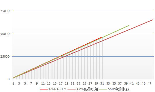 这里以一个20万千瓦的海上风电场为例:选用GW6.45-171机型相对于4兆瓦级别产品,整场吊装费用低约24.3%;相对于5兆瓦级别产品,整场吊装费用低约15.8%。