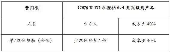这使得GW6.X-171机型能够在一个20万千瓦装机容量的项目中,相比其他机型的检修天数、检修时长、检修人数均明显减少。从人员与交通成本费用上折算,比4兆瓦机型减少8人,人员成本降低40%;减少1艘双体船舶,交通成本降低40%。