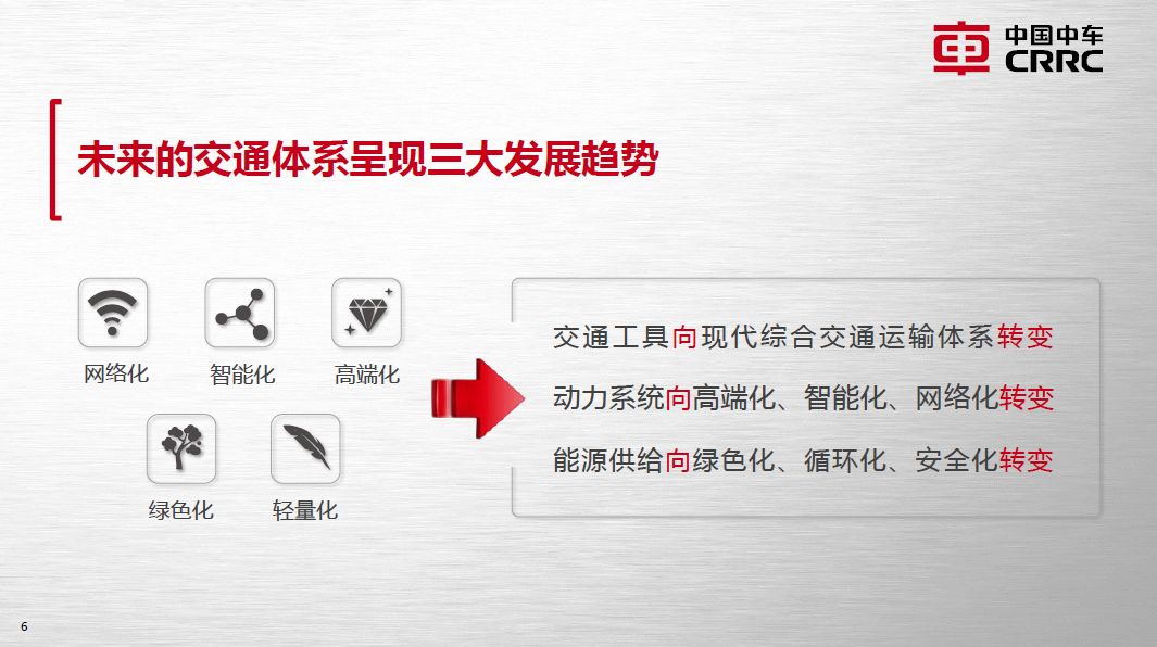 党的十九大提出要以网络化、智能化、高端化、绿色化、轻量化为代表的新技术快速发展。未来的交通体系呈现三大发展趋势:交通工具向现代综合交通运输体系转变;动力系统向高端化、智能化、网络化转变;能源供给向绿色化、循环化、安全化转变。