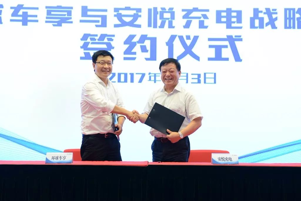 2017年8月3日,安悦充电与环球车享达成战略合作,双方将致力于在新能源绿色出行业务链上探索新的合作模式,在新能源汽车分时租赁、充电基础设施建设推广、平台互联互通、客户资源共享、光伏发电储能系统、广告营销等领域进一步密切合作、优势互补、共同发展。