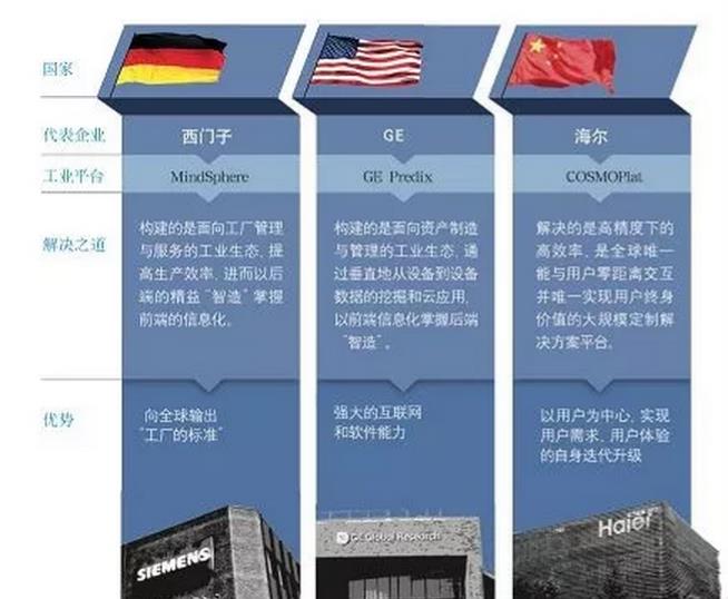 业界评价,智能制造领域已形成德、美、中三足鼎立之势。全球工业平台最有影响力的三家企业分别是:德国的西门子,美国的GE,中国的海尔。