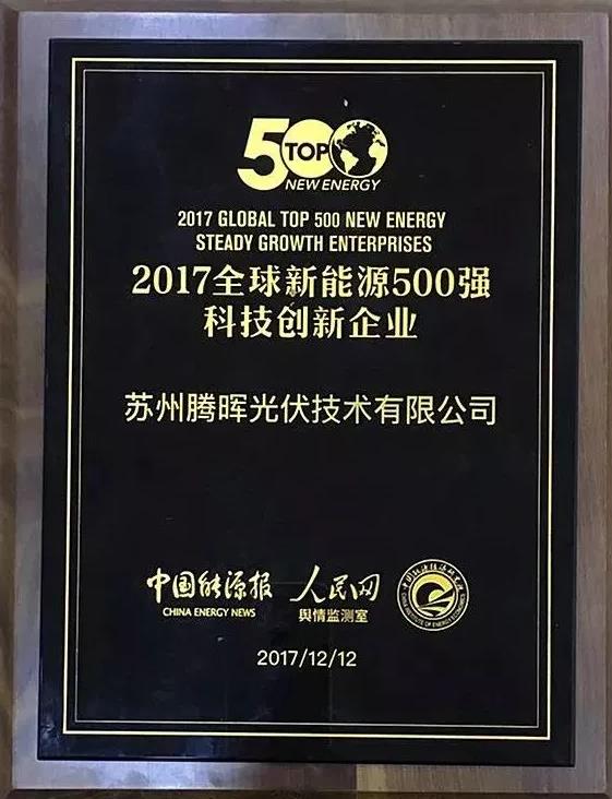 2017年12月12日,备受关注的“2017全球新能源企业500强榜单”发布。中利集团凭借在新能源领域的突出表现,再次登陆全球新能源企业500强榜单,位列第49位,较去年排名上升2位,旗下公司腾晖光伏荣获“2017全球新能源500强科技创新企业”奖项。