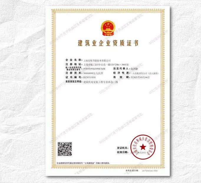 为促进公司业务发展及对外投标需要,本着为客户提供更专业的机电安装服务宗旨,经过努力,2017年8月安悦节能终于获得了“建筑机电安装工程专业承包二级”资质证书!这意味着,公司可承担单项合同额 2000 万元以下的各类建筑工程项目的设备、线路、管道的安装,10 千伏以下变配电站工程,非标准钢结构件的制作、安装。在建筑业机电安装领域,公司的综合业务竞争实力再一次得到了提升,将对公司扩大施工领域、拓展业务空间、提高企业竞争力发挥重大作用,安悦人有了更多的机会,更大的市场,同时也肩负着更多的责任!