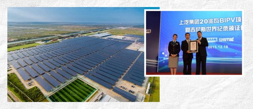 该项目位于杭州湾新区,利用上汽大众宁波基地成品车及员工停车场建设光伏车棚一体化分布式光伏电站。同时可停放车辆2万多辆,实现棚顶发电,棚内为成品车遮阳挡雨,还兼具防冰雹的功能,已建成的一期、二期项目体量达到50.5MW,创造了全球最大光伏建筑一体化电站的吉尼斯世界纪录。该项目每年可产生绿色电力5080万kWh,相当于节约标煤15240吨,减排二氧化碳等有害气体37994吨。为业主带来了可观的经济效益,也创造了良好的社会效益。