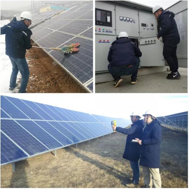 协鑫新能源一线员工在清扫光伏板、检查已运行的箱变。