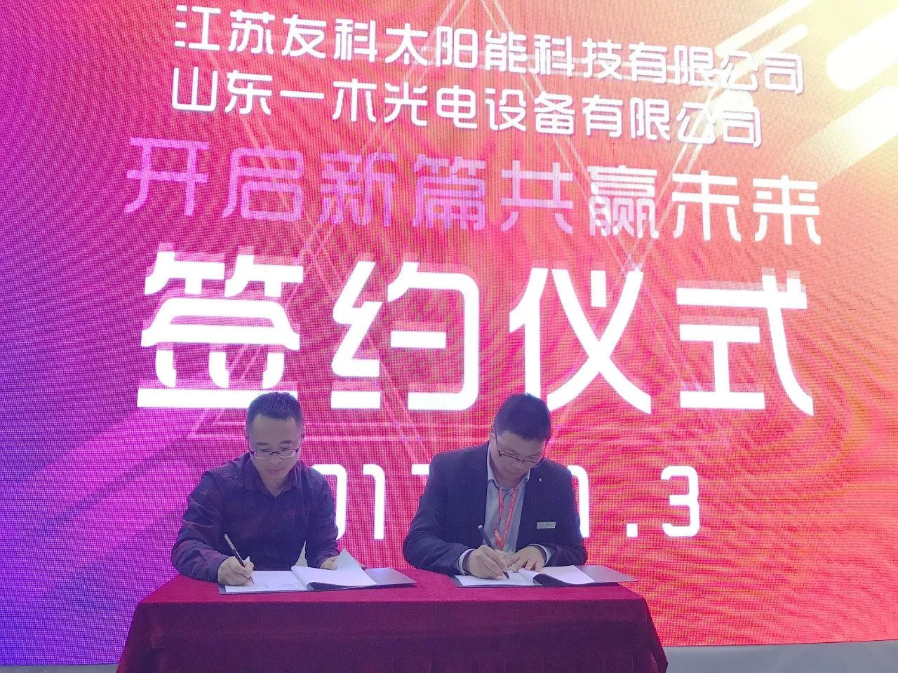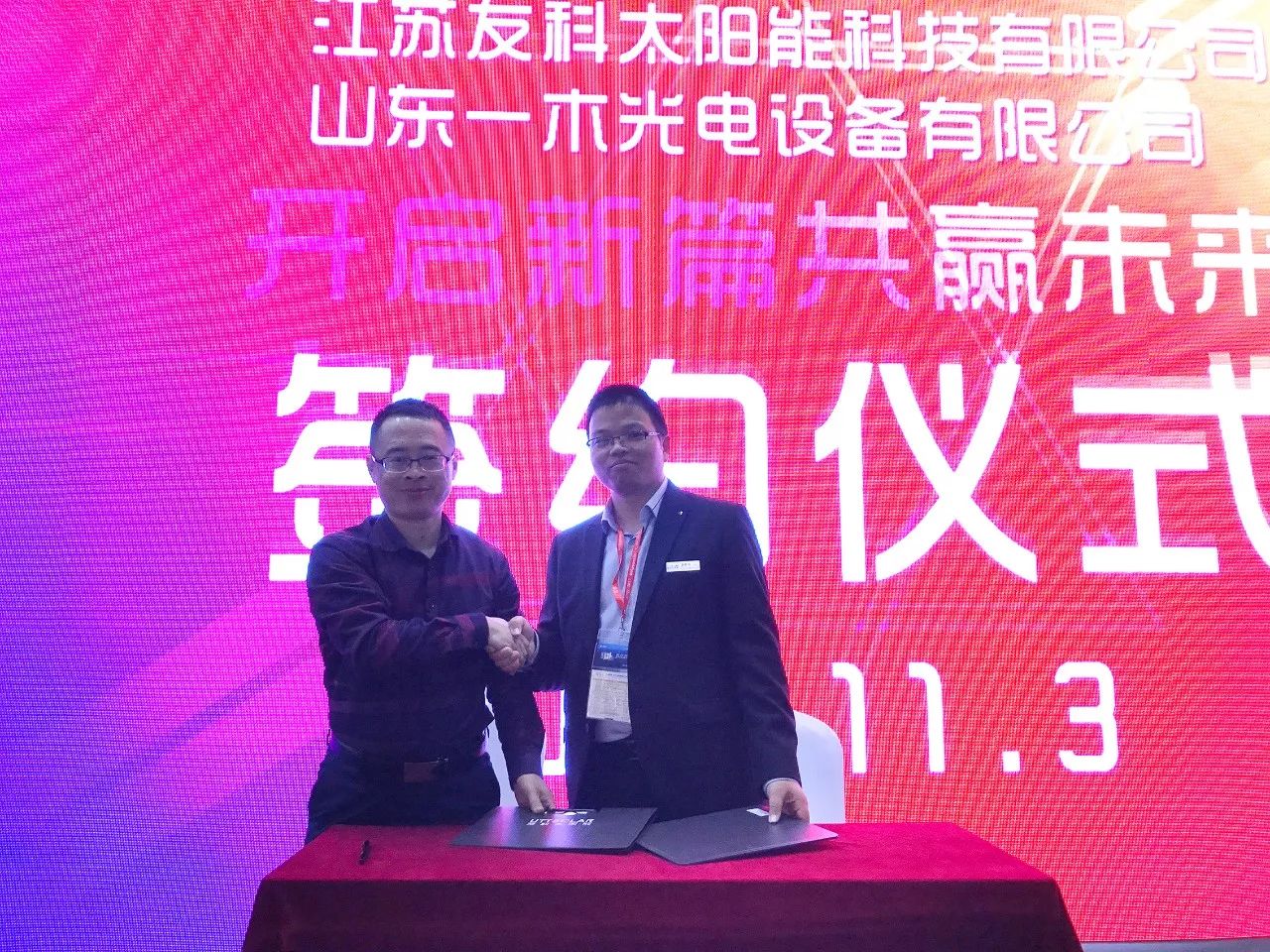山东一木光电设备有限公司总经理李新卫(左)与江苏友科太阳能科技有限公司总经理赵新伟(右)签署战略合作协议