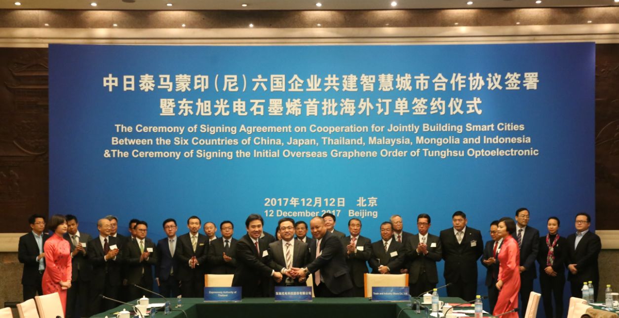与日本、泰国、马来西亚、印度尼西亚、蒙古五国机构在京签署《共建智慧城市合作协议》,同时,与日本大仓株式会社签署了石墨烯散热大功率LED系列照明产品在上述五国的独家代理协议及首批海外销售合同,五国销售额三年将超过1.6亿。