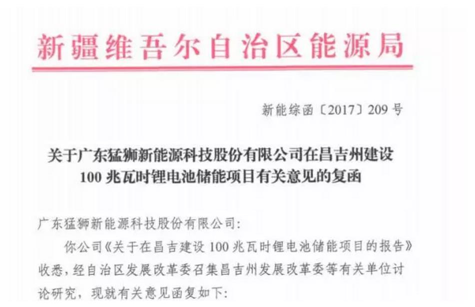 12月18日,猛狮科技上报的《关于在昌吉建设100兆瓦时锂电池储能项目的报告》取得新疆维吾尔自治区能源局(以下简称“自治区能源局”)的核准批复文件,标志着该项目已经获准开展建设。