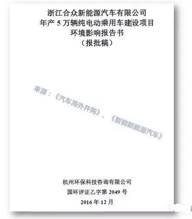 虽然《浙江合众新能源汽车有限公司年产11.5万台套冲压件、车身及零部件建设项目环境影响报告书》已于2016年6月获得了批准,但为了实施整车战略,浙江合众决定在实施年产5万辆纯电动乘用车建设项目后,年产11.5万台套冲压件、车身及零部件建设项目终止。