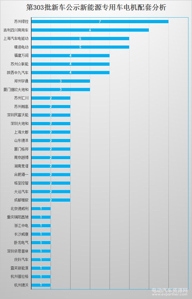 从配套的电机企业来看,据电动汽车资源网统计,77款车型及其底盘由32家电机企业提供配套,有8款车型的电机企业未知。电机市场的竞争十分激烈,其中,配套产品数量较多的有:苏州绿控(7)、吉利四川商用车(6)、上海汽车电驱动(5)、精进电动(5)。(注:因部分车型可选配2家企业的电机,故下图整理的总和超过了车型总和,详情见附表。)