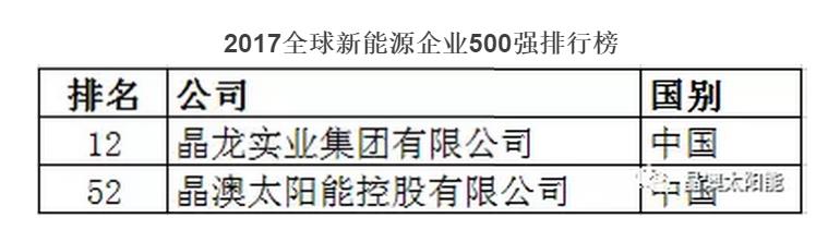 “2017全球新能源500强”公布,晶龙、晶澳分别位列第12、52位