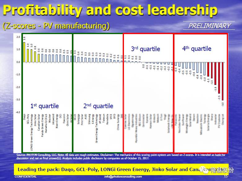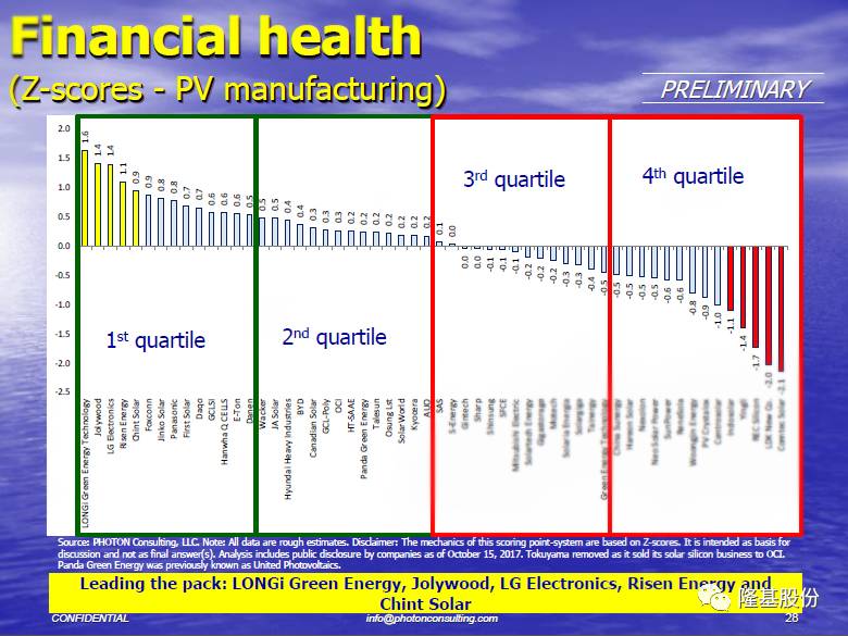 日前,PHOTON Consulting发布了2017年第三季度全球光伏企业“铁人三项”竞争力报告《PV Triathlon》,隆基绿能科技股份有限公司(以下简称“隆基股份”)凭借领先的技术实力位列综合竞争力第一梯队,财务健康指数稳居全球第一。