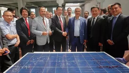 土耳其总统能源特别顾问Dr.DavutKavranoglo、中国出口信用保险公司江苏分公司总经理汪涤凡、江苏苏美达集团总裁蔡济波以及Smart Energy集团总裁Halil Demirdag参加了仪式,并在象征投产的第一块光伏组件上签字留念。