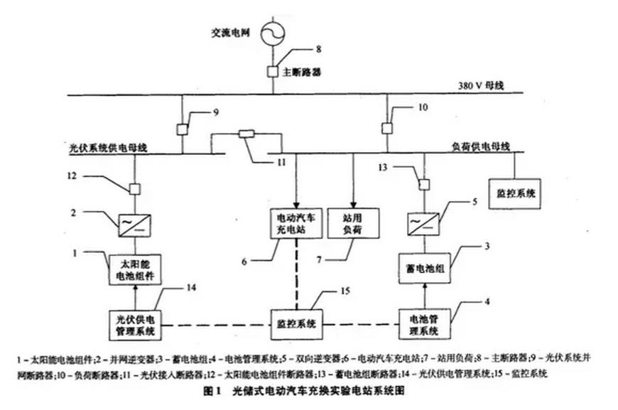 与“擎天柱”计划相比,黑龙江省电力科学研究院建设的光储式电动汽车充换电实验站,由光伏发电系统、蓄电池储能系统、电动汽车充电站、站用负荷单元组成,没有采用梯次电池作为储能结构。其工作运行系统图如下:
