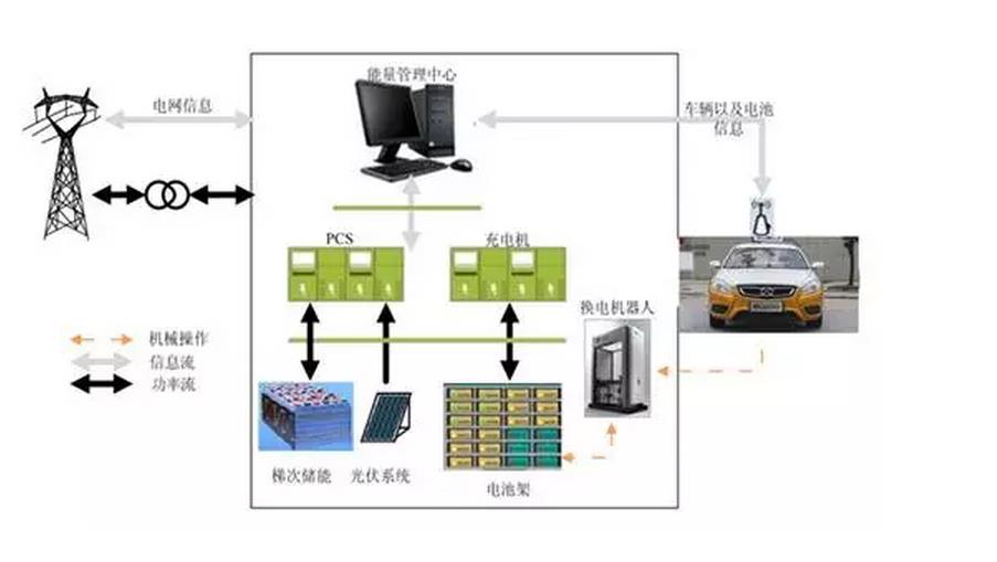 “擎天柱计划”发布的光储换电站占地仅约为150-300平方,并非区域中心级的充换电站,但仍同时具备充电站、换电站、储能电站的功能。电网、车辆、电池、功率调节系统(Power Condition System, PCS)、光伏及梯次储能系统等将其功率、数据信息上传到能量管理中心,由能量管理中心对储能电池和动力电池的功率及能量进行优化控制,并与电网进行协调与互动。