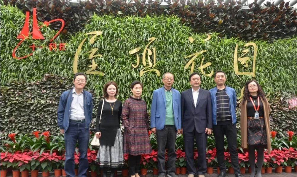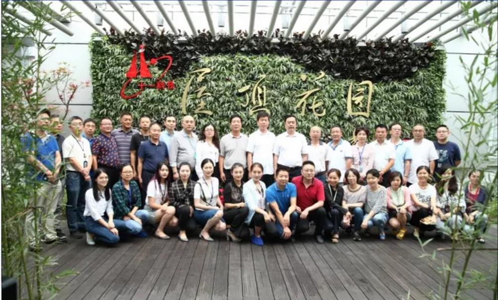 2017年10月19日原CEC总经理杨晓堂同志、无锡市常务副市长黄钦一行与成都市常务副市长谢瑞武(左五)、成华区委刘光强书记(左二)同十一科技董事长兼党委书记赵振元同志、执行院长何平同志在十一科技屋顶花园亲切合影