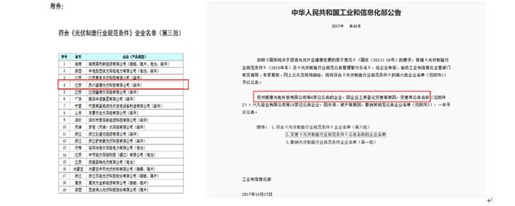 卓越品质离不开生产过程的严格管理,爱康五好家电站的组件生产企业爱康光电早在2014年就登上了工业和信息化部发布的“符合《光伏制造行业规范条件》企业名单(第三批)”名单。近10年过去,光伏行业起起伏伏,有很多企业因不符合《光伏制造行业规范条件》而被除名,而爱康依然秉持着持续创新精益求精的精神为客户带去品质精良的产品,且在2017年10月25日公布的工业和信息化部[2017年第43号]公告中,爱康作为代表被提及了更名的状态。