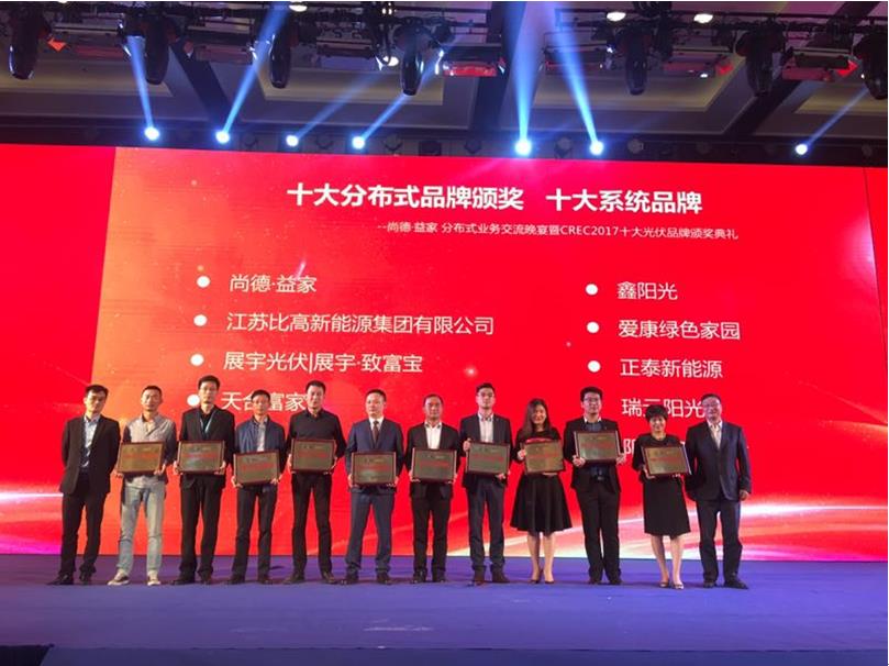 2017年11月2-4日,“第九届中国(无锡)国际新能源大会暨展览会(CREC2017)”在无锡太湖国际博览中心举行。本届展会以“新城镇、新能源、新生活”为主题,将展示太阳能光伏、分布式能源、储能、能源互联网以及新能源汽车、充电桩等产品与业务。同期主办方于3日晚在无锡君来世尊酒店举办了“尚德•益家”分布式光伏业务主题晚宴并隆重举行“中国十大户用光伏品牌评选”颁奖仪式,江苏爱康绿色家园科技有限公司作为受邀嘉宾参加此次评选并荣获2017年”中国十大户用光伏系统品牌”大奖。