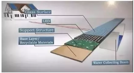 其实,这些六边形的“电子线路”,叫做 Solar Brick。这里面的每个六角形的钢化玻璃从上往下依次分成这些层: