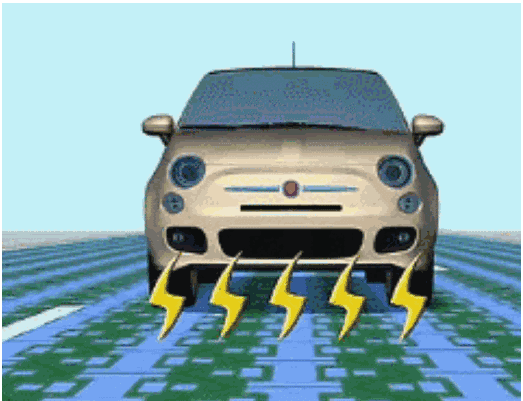 它可以给在其上行驶和停泊的电动汽车进行无线磁感应充电。这就像手机无线充电一样,