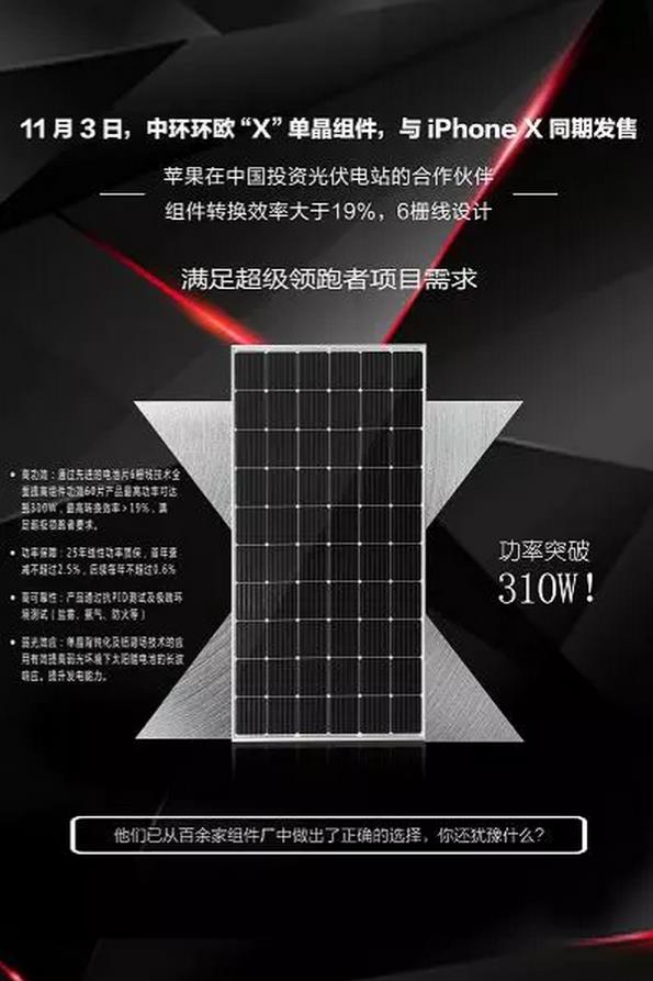 一向低调的中环股份这次却罕见的“高调”起来,新品“X”单晶组件选择与iPhoneX同期发售。原来,中环与苹果早有渊源。2015年,中环与苹果在光伏电站达成合作,据Solarbe了解,中环是苹果在中国投资光伏电站的合作伙伴,双方成立合资公司从事光伏电站的开发与综合利用。