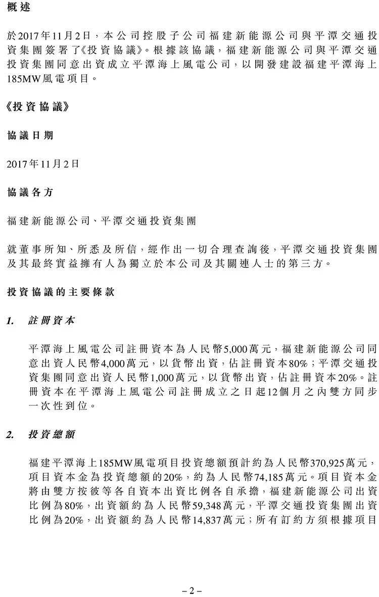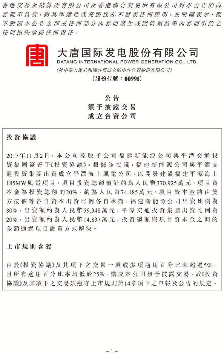 大唐集团的旗下上市公司大唐发电(00991.HK)11月2日晚间公告,公司控股子公司福建新能源当日与平潭交通投资集团签署协议,拟成立合资公司平潭海上风电,共同开发建设福建平潭海上185MW风电项目,其中福建新能源出资4000万元持股80%。该风电项目总投资37.09亿元,项目资本金为7.42亿元。该项目系大唐发电首个海上风电项目。