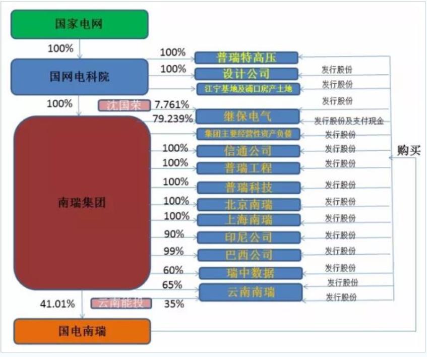其中,以发行股份方式购买国网电科院所持普瑞特高压100%股权、设计公司100%股权、江宁基地及浦口房产土地;以发行股份方式购买南瑞集团持有的主要经营性资产及负债;以发行股份方式购买南瑞集团所持信通公司100%股权、普瑞工程100%股权、普瑞科技100%股权、北京南瑞100%股权、上海南瑞100%股权、印尼公司90%股权、巴西公司99%股权、瑞中数据60%股权、云南南瑞65%股权;以发行股份方式购买云南能投所持有的云南南瑞35%股权;以发行股份及支付现金方式购买南瑞集团所持有的继保电气79.239%股权,其中现金支付比例为继保电气79.239%股权交易作价的14.60%;以发行股份方式购买沈国荣所持有的继保电气7.761%股权。