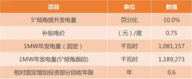 每种不同的平单轴跟踪系统随着倾斜角度的不同,它与固定式安装的光伏发电系统发电量增加的比例也有所不同。完全跟踪式平单轴跟踪系统发电量增加7.3%,平单轴5度倾斜角的增加量为10%,平单轴10度倾斜角增加量为11.2%